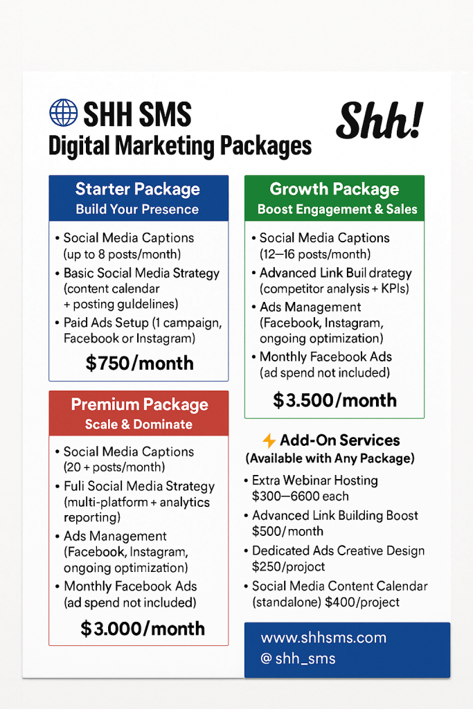 Extra Webinar Hosting: $300β$600 each Advanced Link Building Boost: $500/month Dedicated Ads Creative Design: $250/project Social Media Content Calendar (standalone): $400/project