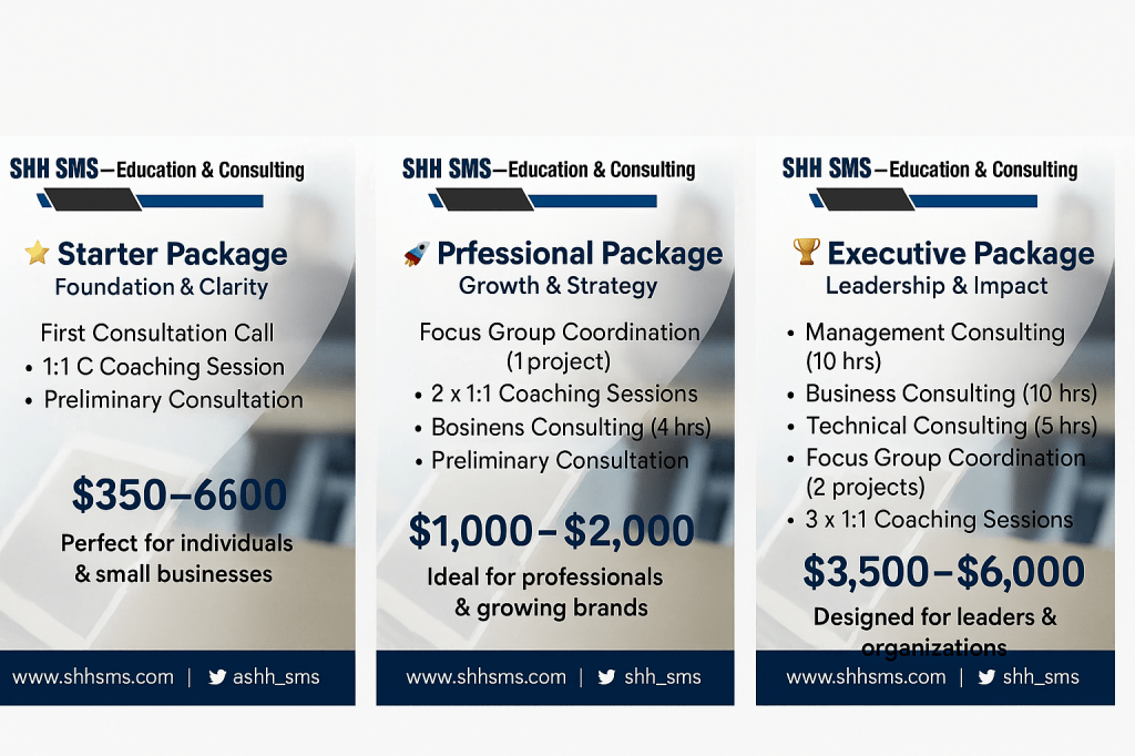 At SHH SMS, we believe knowledge and strategy are the foundation of lasting success. Whether youβre an entrepreneur, organization, or creative professional, our consulting and coaching services are designed to give you clarity, direction, and actionable solutions that help you thrive.